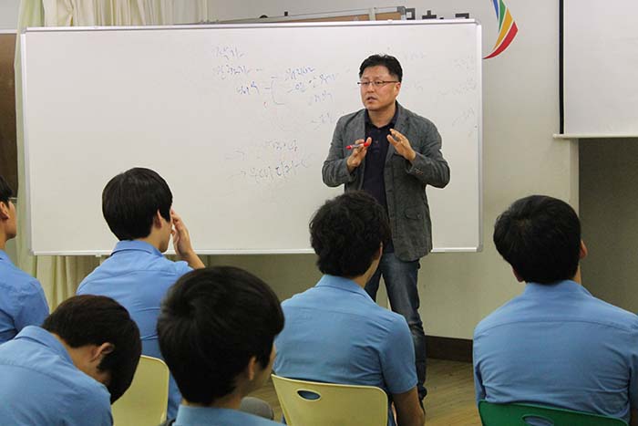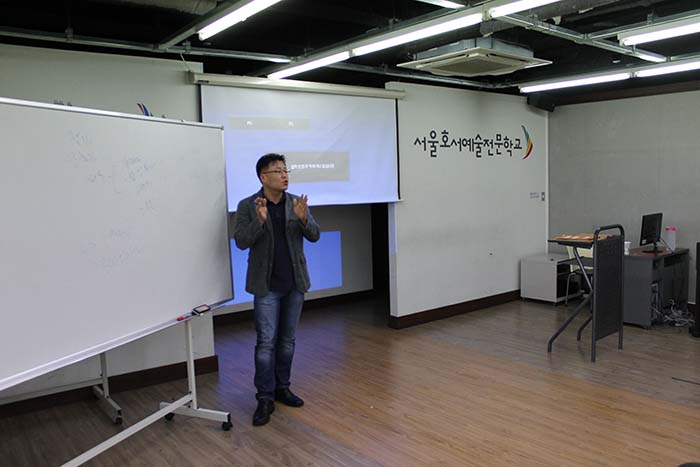 우리학교 한윤섭 교수가 열심히 강의를 하고 있어요. 연극이 올라가기까지의 과정을 열심히 알려주는 한윤섭 교수님!