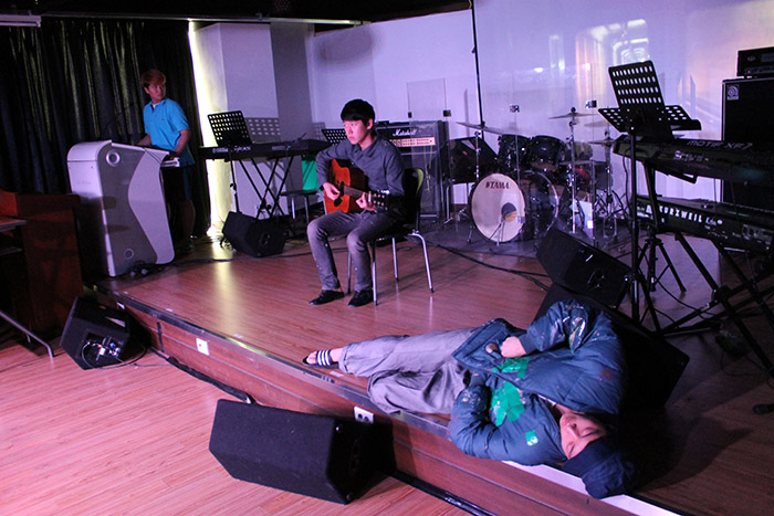 노래가 끝나고 어디선가 지하철 소리가 들렸는데요. 진짜 지하철에 있는 노숙자처럼 연기를 하는 연기과 학생!