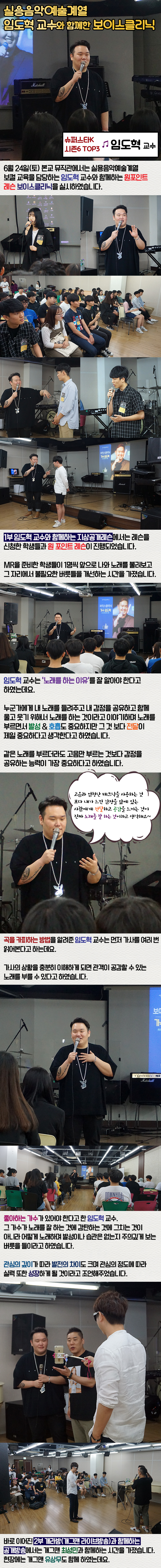 6월 24일(토) 본교 뮤직관에서는 실용음악예술계열 보컬교육을 담당하는 임도혁 교수와 함께하는 원포인트 레슨 보이스클리닉을 실시하였습니다.