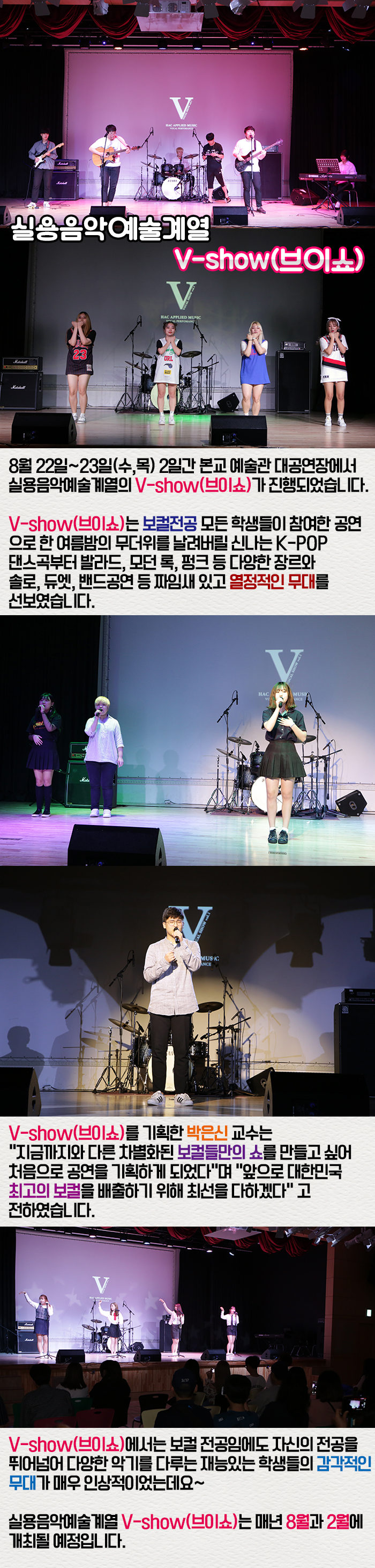 8월 22일~23일(수,목) 2일간 본교 예술관 6층 대공연장에서 실용음악예술계열의 V-show(브이쇼)가 진행되었습니다.