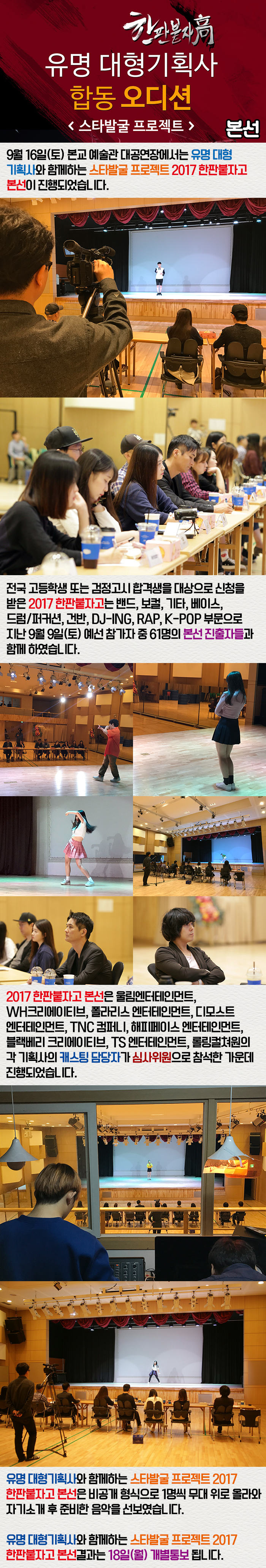 9월 16일(토) 본교 예술관 대공연장에서는 유명 대형기획사와 함께하는 스타발굴 프로젝트 2017 한판붙자고 본선이 진행되었습니다.