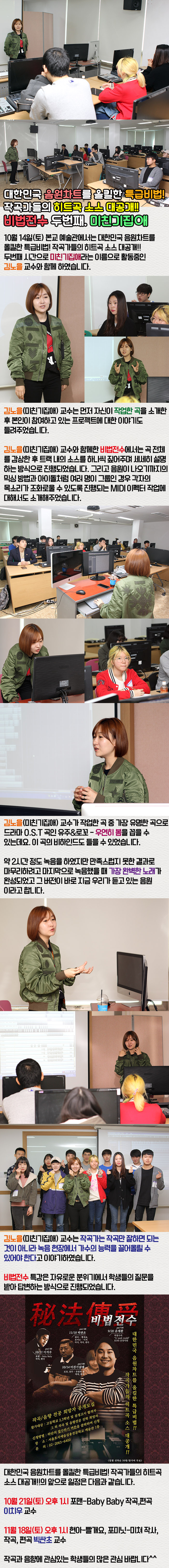 10월 14일(토) 본교 예술관에서는 대한민국 음원차트를 올킬한 특급비법! 작곡가들의 히트곡 소스 대공개!! 두번째 시간으로 미친기집애라는 이름으로 활동중인 김노을 교수와 함께 하였습니다.