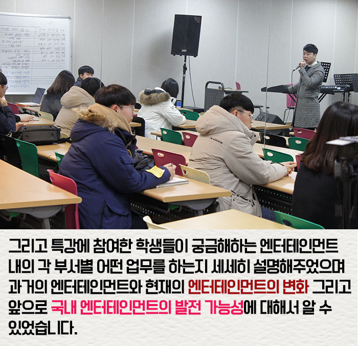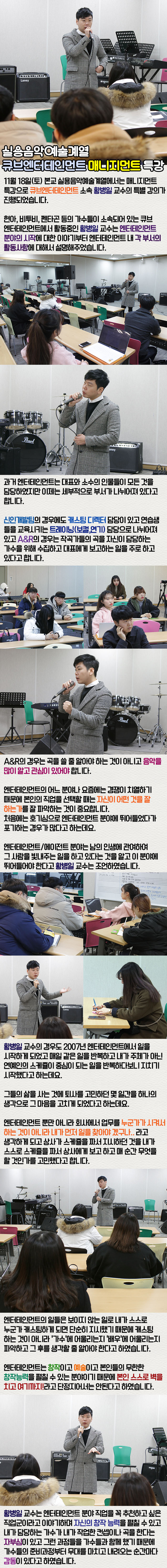 11월 18일(토) 본교 실용음악예술계열에서는 매니지먼트 특강으로 큐브엔터테인먼트 소속 황병일 교수의 특별 강의가 진행되었습니다.