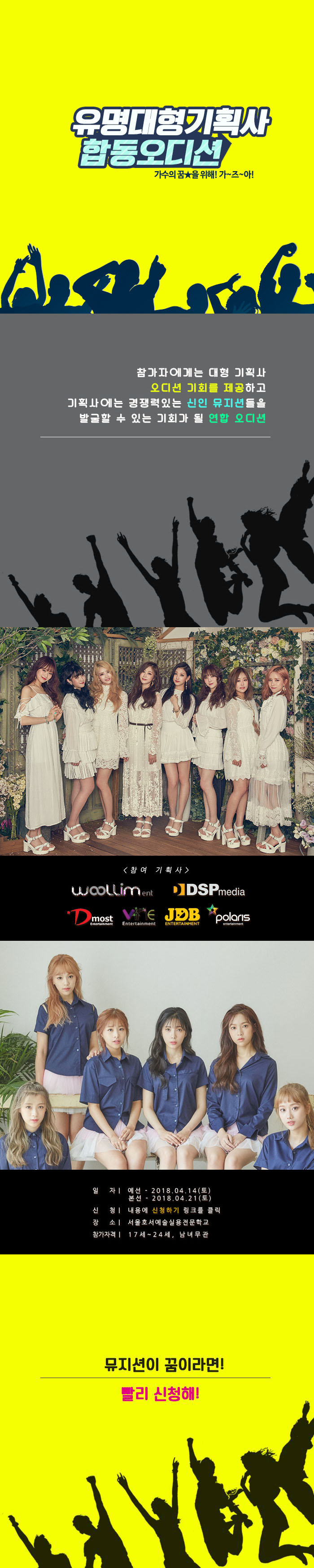 대형기획사 6곳에서 함께하는 이번 유명대형기획사 합동오디션 대회에 많은 참여 바랍니다.