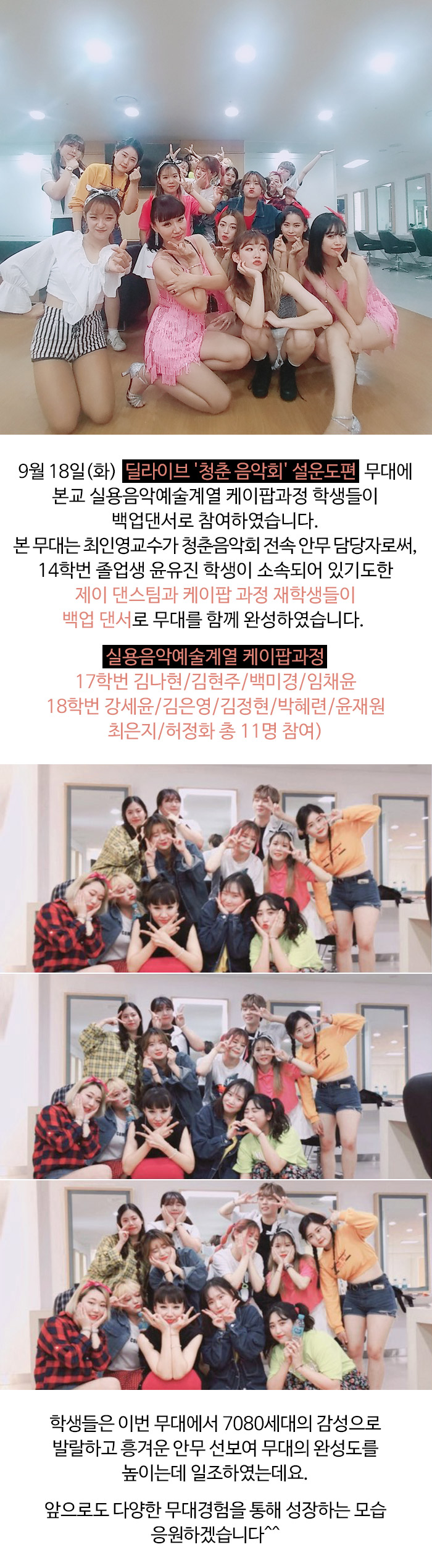 9월 18일 (화) 딜라이브 '청춘 음악회' 설운도편 무대에 본교 실용음악예술계열 케이팝과정 학생들이 백업댄서로 참여하였습니다.