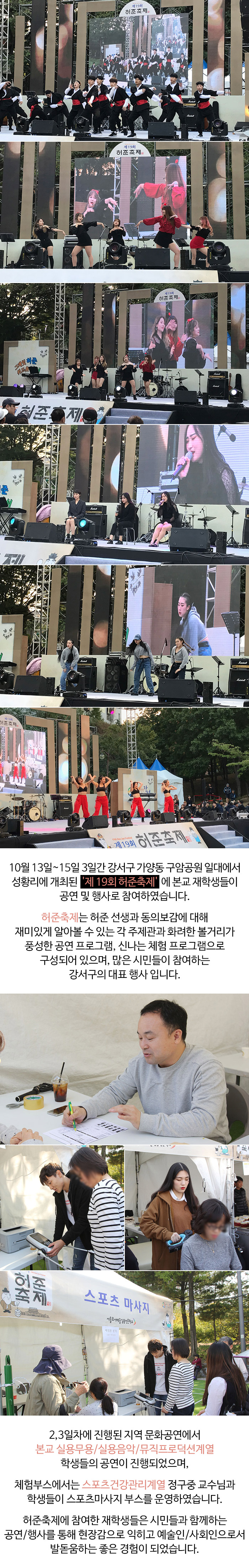 10월 13일~15일 3일간 강서구 가양동 구암공원 일대에서 성황리에 개최된 '제 19회 허준축제'에 본교 재학생들이 공연 및 행사로 참여하였습니다.