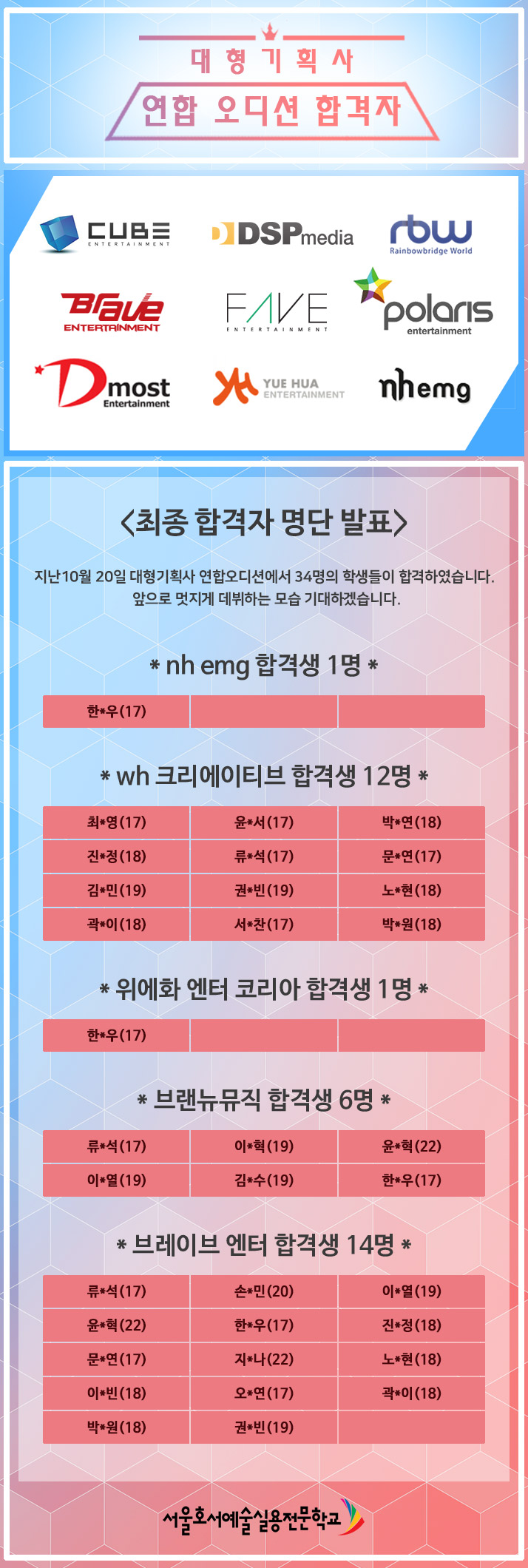 지난 10월 20일 대형 기획사 연합 최종 오디션에서 34명의 학생들이 합격하였습니다.