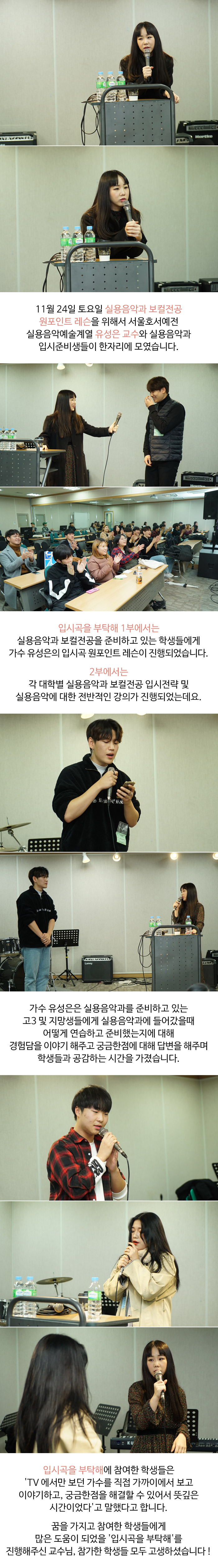 11월 24일(토) 실용음악과 보컬전공 원포인트 레슨을 위해서 서울호서예전 실용음악예술계열 유성은 교수와 실용음악과 입시준비생들이 한자리에 모였습니다.