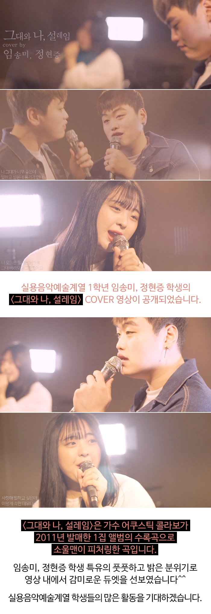 실용음악예술계열 1학년 임송미, 정현증 학생의 '그대와 나, 설레임' COVER 영상이 공개되었습니다.