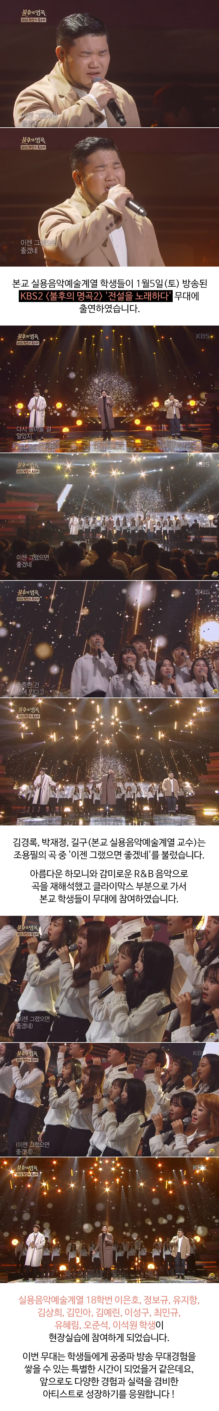 본교 실용음악예술계열 학생들이 1월5일(토) 방송된 KBS2 '불후의 명곡2 - 전설을 노래하다' 무대에 출연하였습니다.