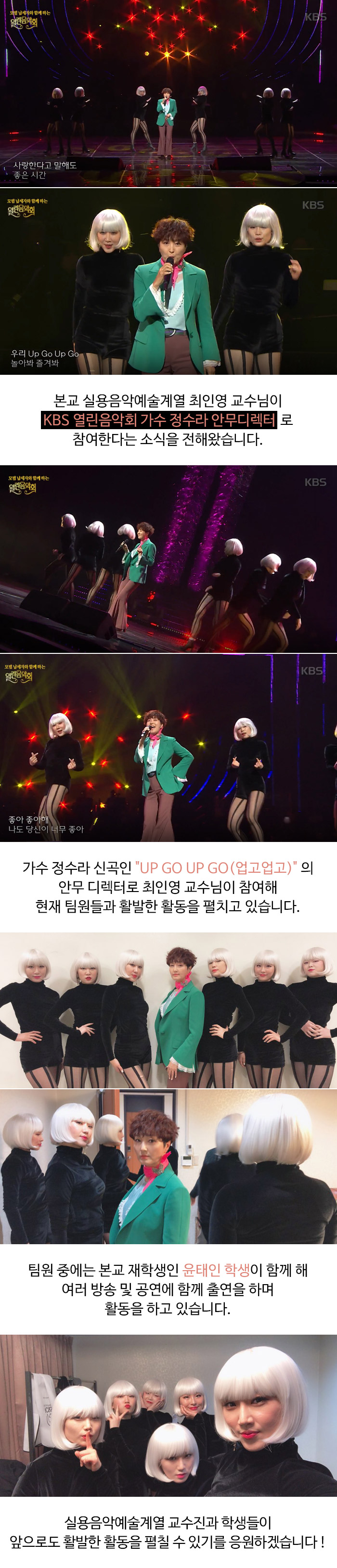 본교 실용음악예술계열 최인영 교수님이 KBS 열린음악회 가수 정수라 안무디렉터로 참여한다는 소식을 전해왔습니다.