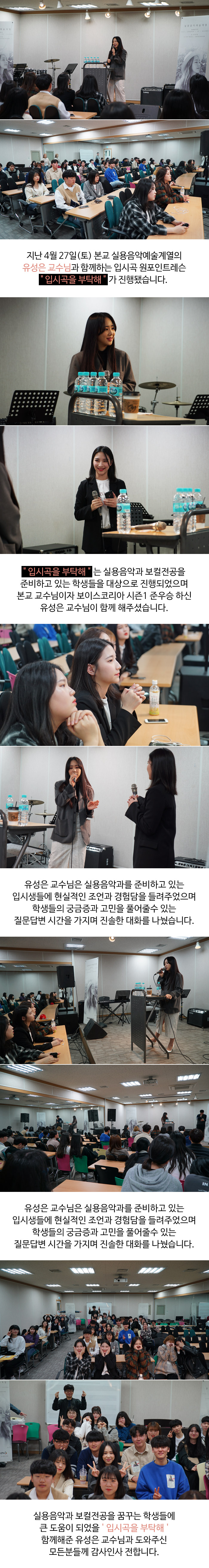 지난 4월 27일(토) 본교 실용음악예술계열의 유성은 교수님과 함께하는 입시곡 원포인트레슨 "입시곡을 부탁해"가 진행됐습니다.