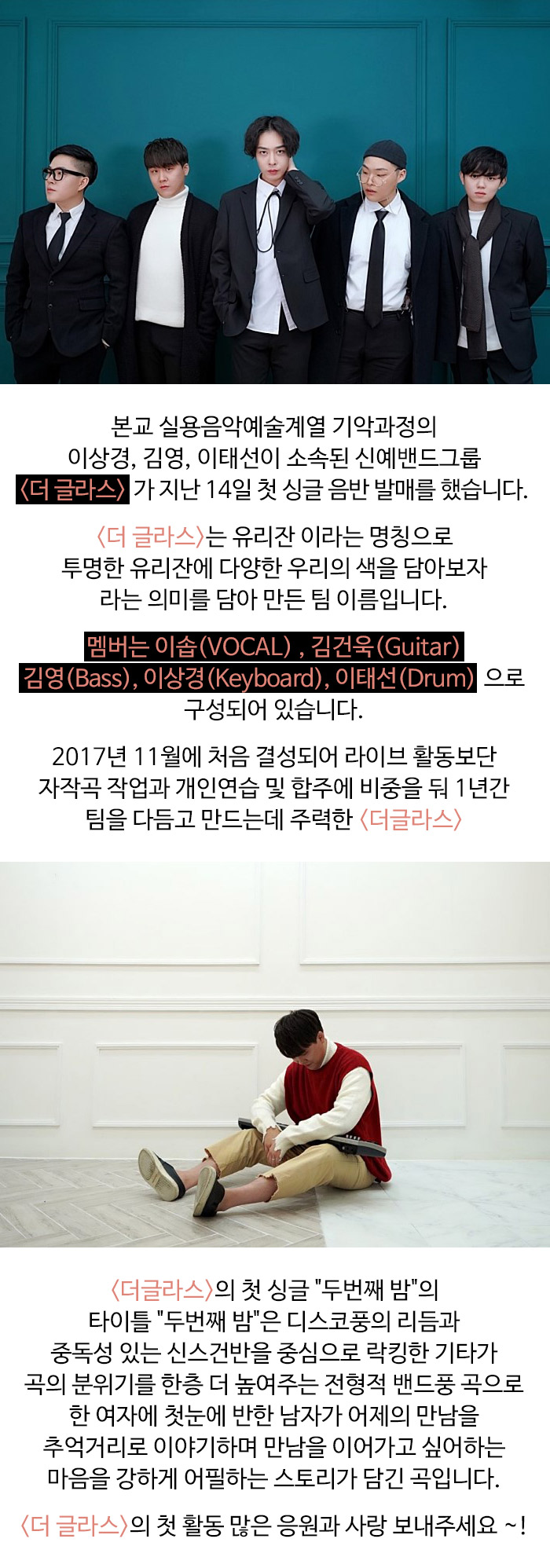 본교 실용음악예술계열 기악과정의 이상경, 김영, 이태선이 소속된 신예밴드그룹 < 더 글라스 >가 지난 14일 첫 싱글 음반 발매를 했습니다.