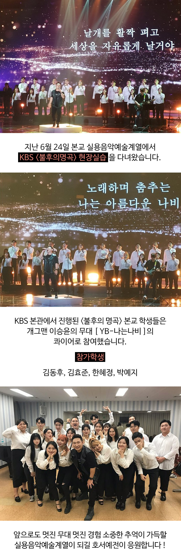 지난 6월 24일 본교 실용음악예술계열에서 KBS < 불후의명곡 > 현장실습을 다녀왔습니다.