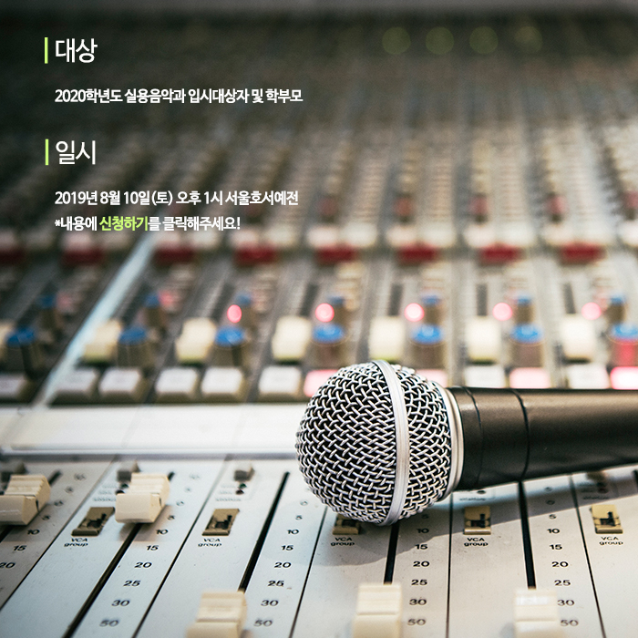 오는 2019년 8월 10일(토) 실용음악과 입시생들을 위한 전국 실용음악과 입시전략설명회가 아래와 같이 개최됩니다. 입시를 준비하고 있는 여러분들의 많은 참여 바랍니다.