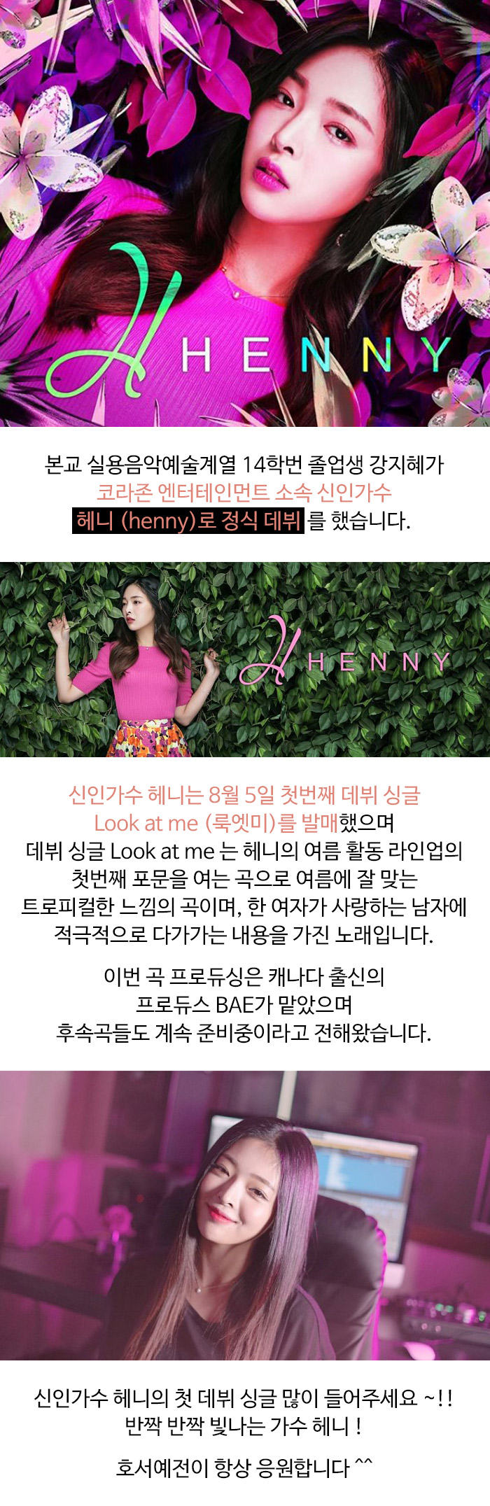 본교 실용음악예술계열 14학번 졸업생 강지혜가 코라존 엔터테인먼트 소속 신인가수 헤니(henny)로 정식 데뷔를 했습니다.