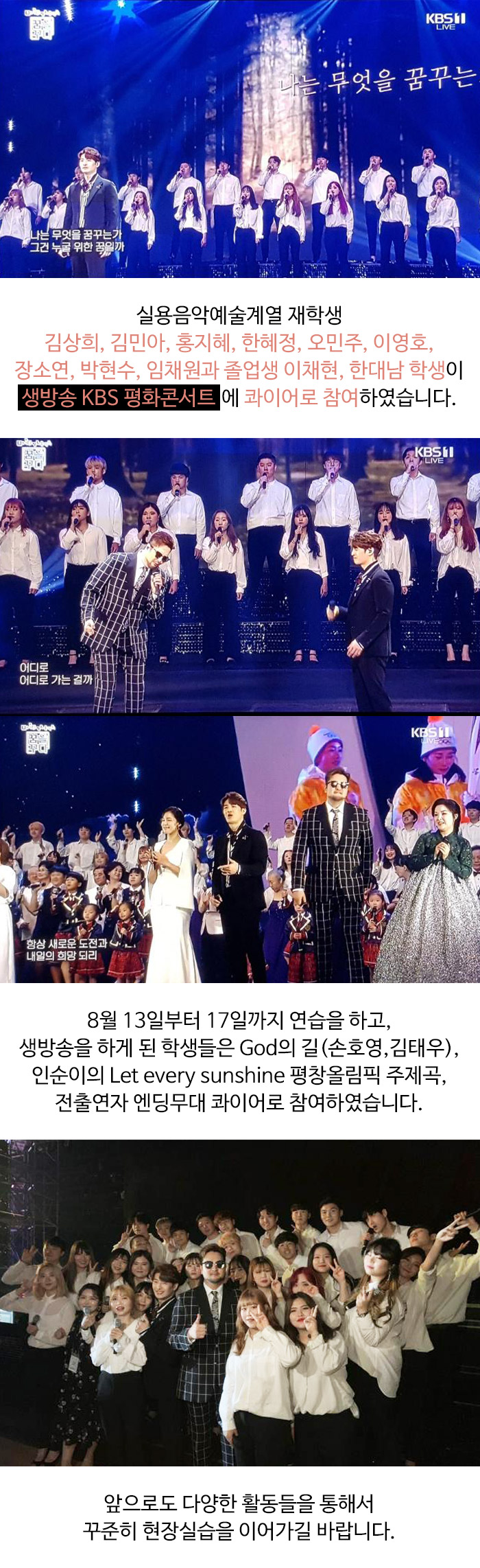 실용음악예술계열 재학생들이 생방송 KBS 평화콘서트에 콰이어로 참여하였습니다.