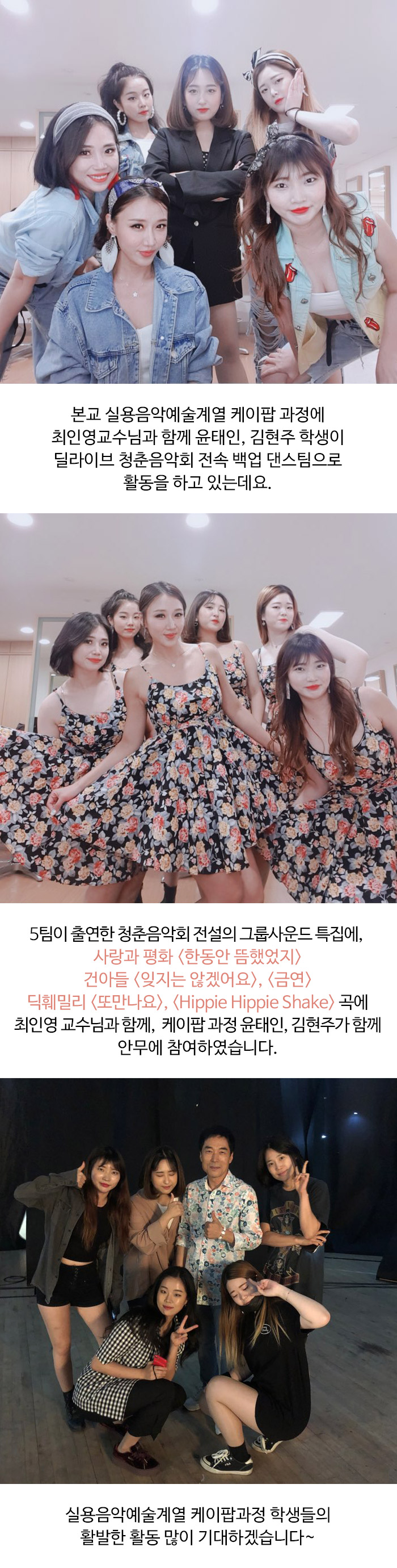 본교 실용음악예술계열 케이팝 과정에 최인영교수님과 함께 윤태인, 김현주 학생이 딜라이브 '청춘음악회' 전속 백업 댄스팀으로 활동을 하고 있는데요.