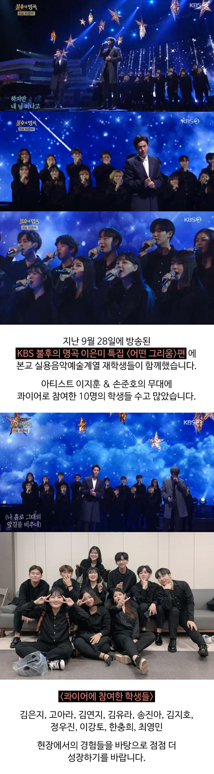 지난 9월 28일에 방송된 KBS 불후의 명곡 이은미 특집 '어떤 그리움'편에 본교 실용음악예술계열 재학생들이 함께했습니다.