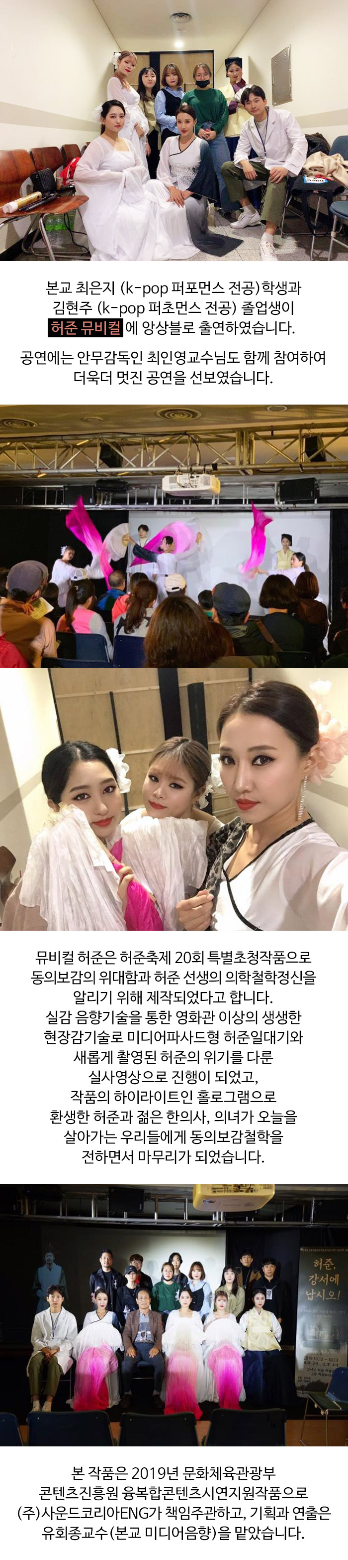 본교 최은지 (k-pop 퍼포먼스 전공)학생과 김현주 (k-pop 퍼초먼스 전공) 졸업생이 허준 뮤비컬에 앙상블로 출연하였습니다.
