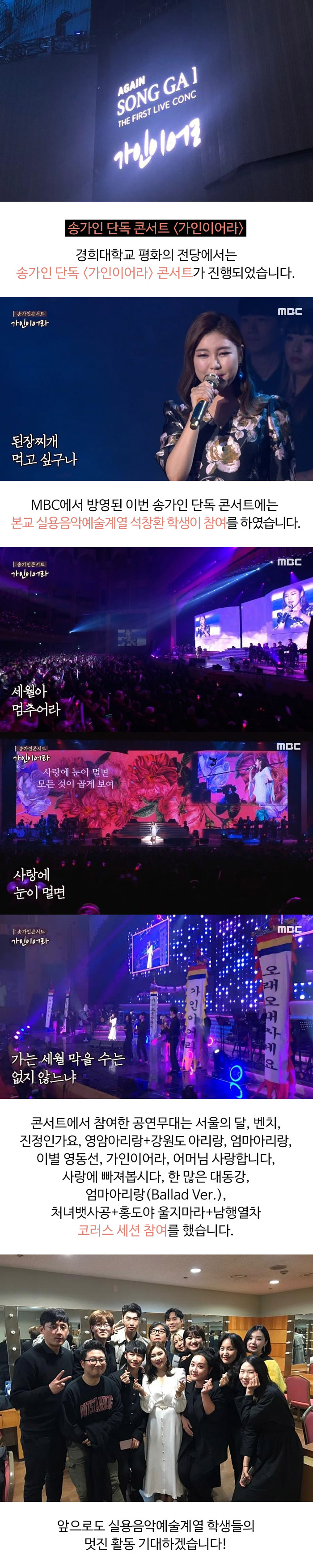 MBC에서 방영된 이번 송가인 단독 콘서트에는 본교 실용음악예술계열 석창환 학생이 코러스 세션으로 참여를 하였습니다.