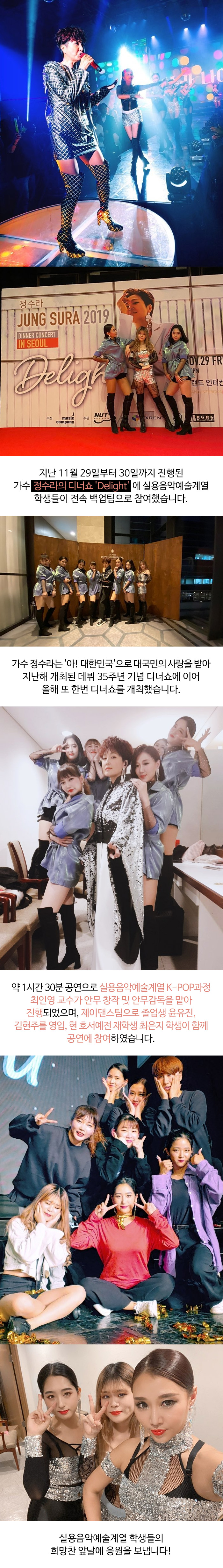 지난 11월 29일부터 30일까지 진행된 가수 정수라의 디너쇼 'Delight' 에 실용음악예술계열 학생들이 전속 백업팀으로 참여했습니다.