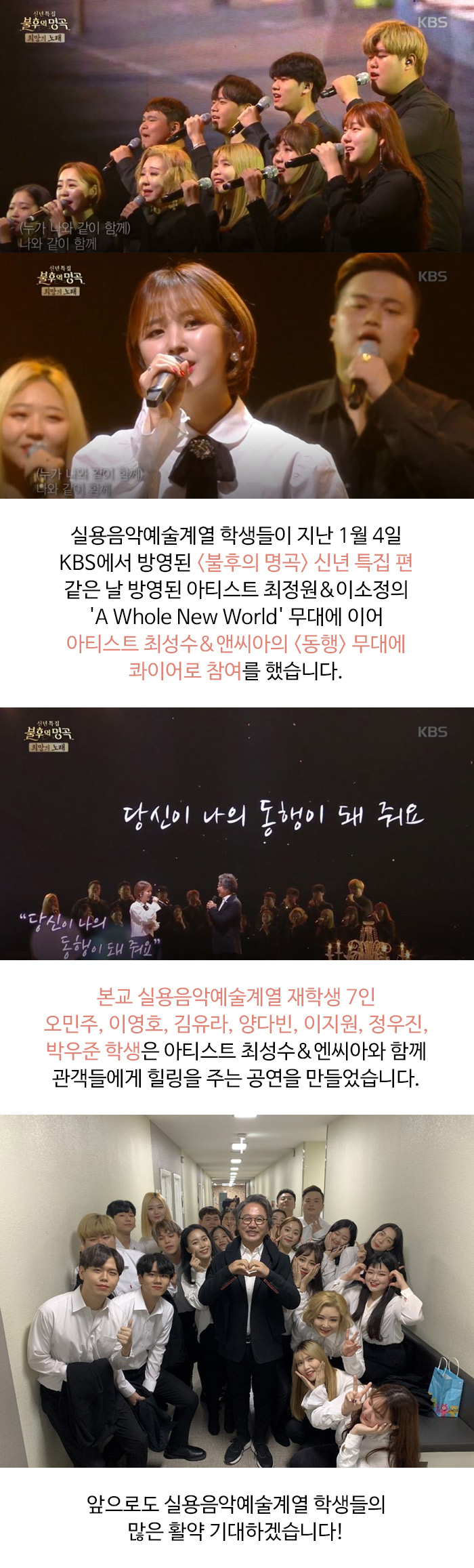 실용음악예술계열 학생들이 지난 1월 4일 KBS에서 방영된 '불후의 명곡' 신년 특집 편 같은 날 방영된 아티스트 최정원&이소정의 'A Whole New World' 무대에 이어 아티스트 최성수&앤씨아의 '동행' 무대에 콰이어로 참여를 했습니다.