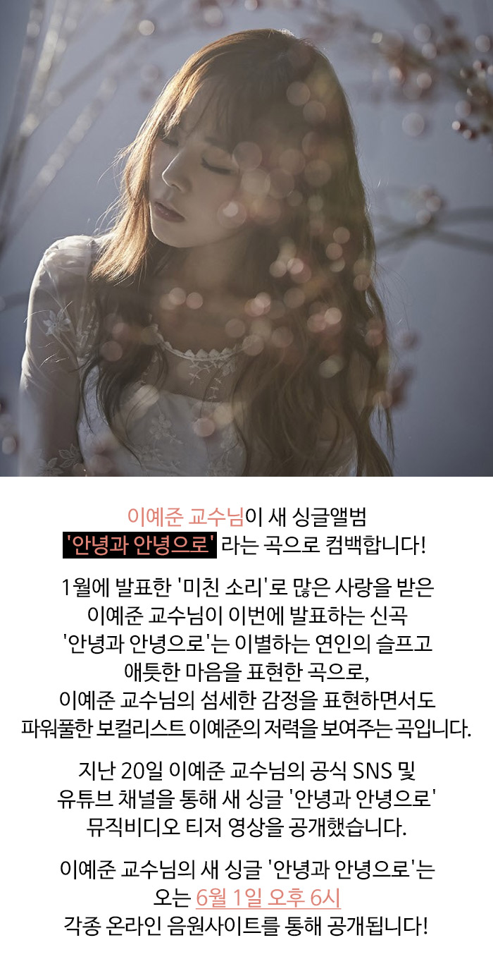 이예준 교수님이 새 싱글앨범 '안녕과 안녕으로' 라는 곡으로 컴백합니다!