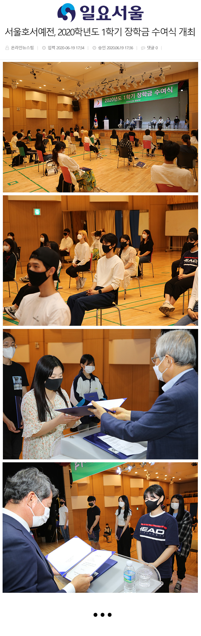서울호서예전 이운희 이사장은 “학교생활을 열심히 하고 있는 학생들에게 감사의 뜻을 전하며, 코로나19 확산 방지를 위하여 모임 금지 및 학생들의 안전과 마스크 착용, 손 소독을 당부하며, 앞으로도 꿈을 위해 열정을 다해 노력해줄 것을 당부했다. 또한 돌아오는 2020년 2학기에도 많은 학생들이 장학금의 혜택을 받고 꿈을 위해 앞으로 전진하기를 바란다”고 전했다.