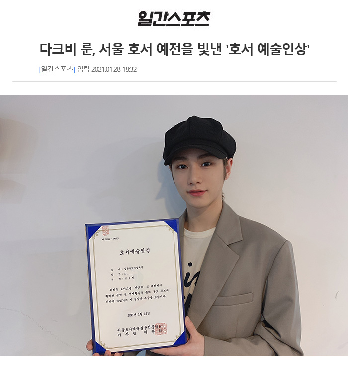 다크비(DKB)의 멤버 룬(정성민)이 서울 호서 예전을 빛낸 호서 예술인상을 수상했다.