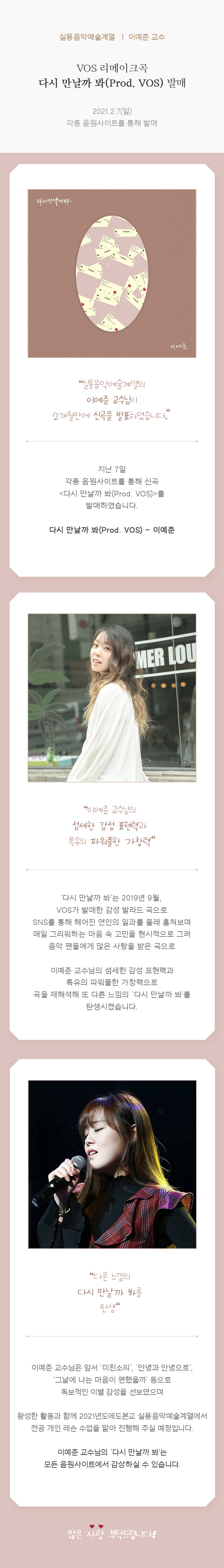 실용음악예술계열 이예준 교수, VOS 리메이크곡 <다시 만날까 봐(Prod. VOS)> 발매