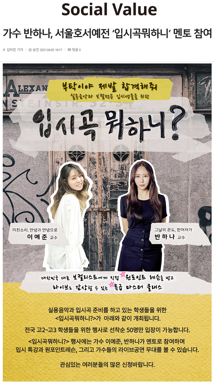 가수 반하나가 오는 24일 오후 1시 가양동에 위치한 서울호서예술실용전문학교(이하 서울호서예전)에서 개최되는 고2~고3 또는 2022학년도 실용음악과 보컬전공 입시 대상자들을 위한 '입시곡뭐하니'에 멘토로 참여한다.