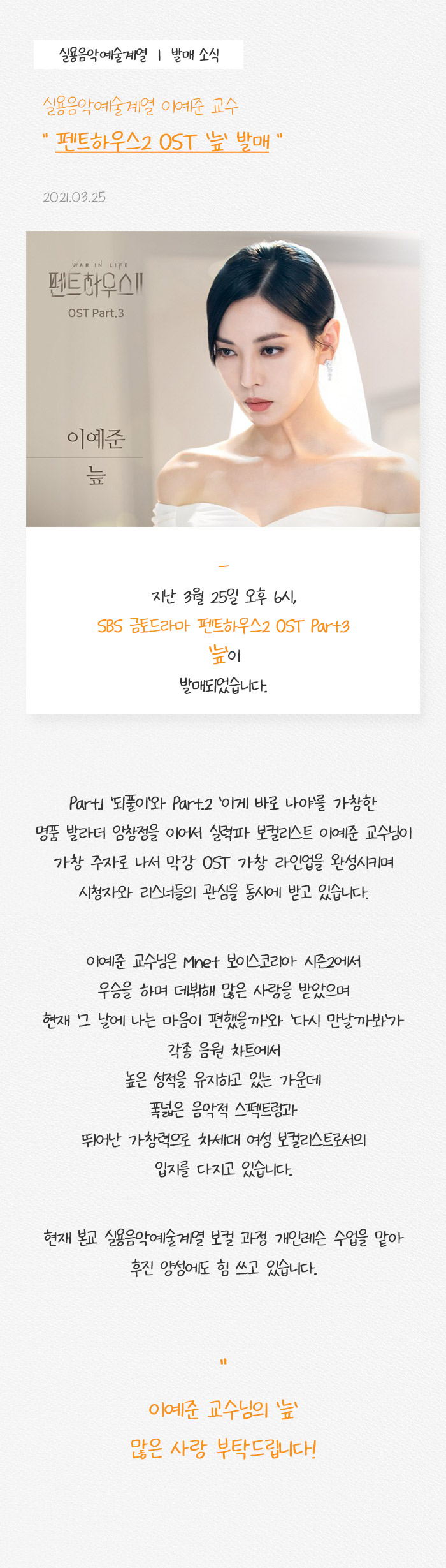 실용음악예술계열 이예준 교수, 펜트하우스2 OST '늪' 발매