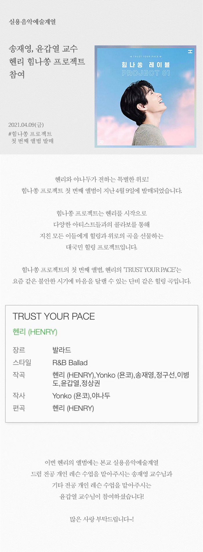 실용음악예술계열 송재영, 윤갑열 교수 헨리 힘나쏭 프로젝트 참여