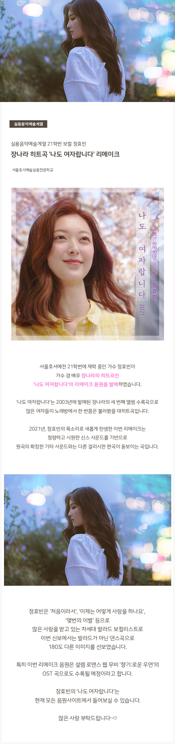 실용음악예술계열 21학번 보컬 정효빈, 장나라 히트곡 '나도 여자랍니다' 리메이크