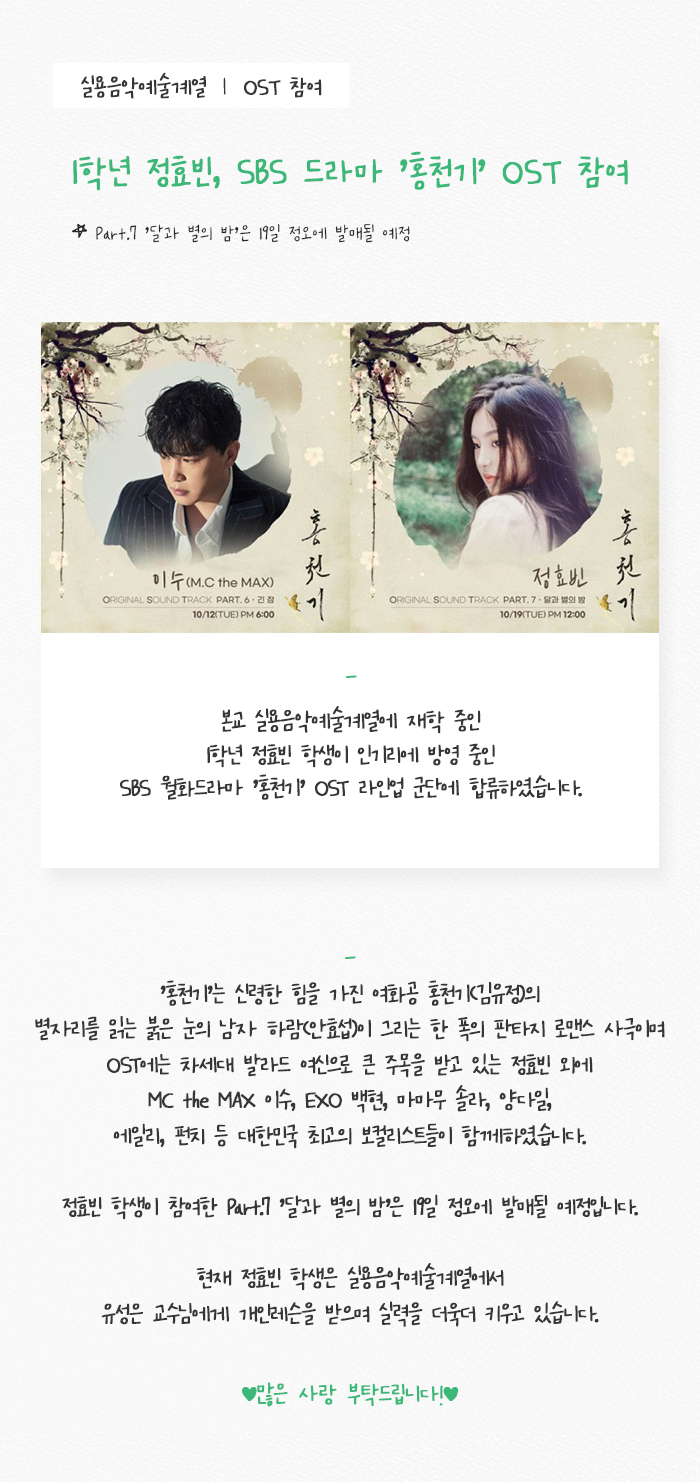 실용음악예술계열 1학년 정효빈, SBS 드라마 '홍천기' OST 참여