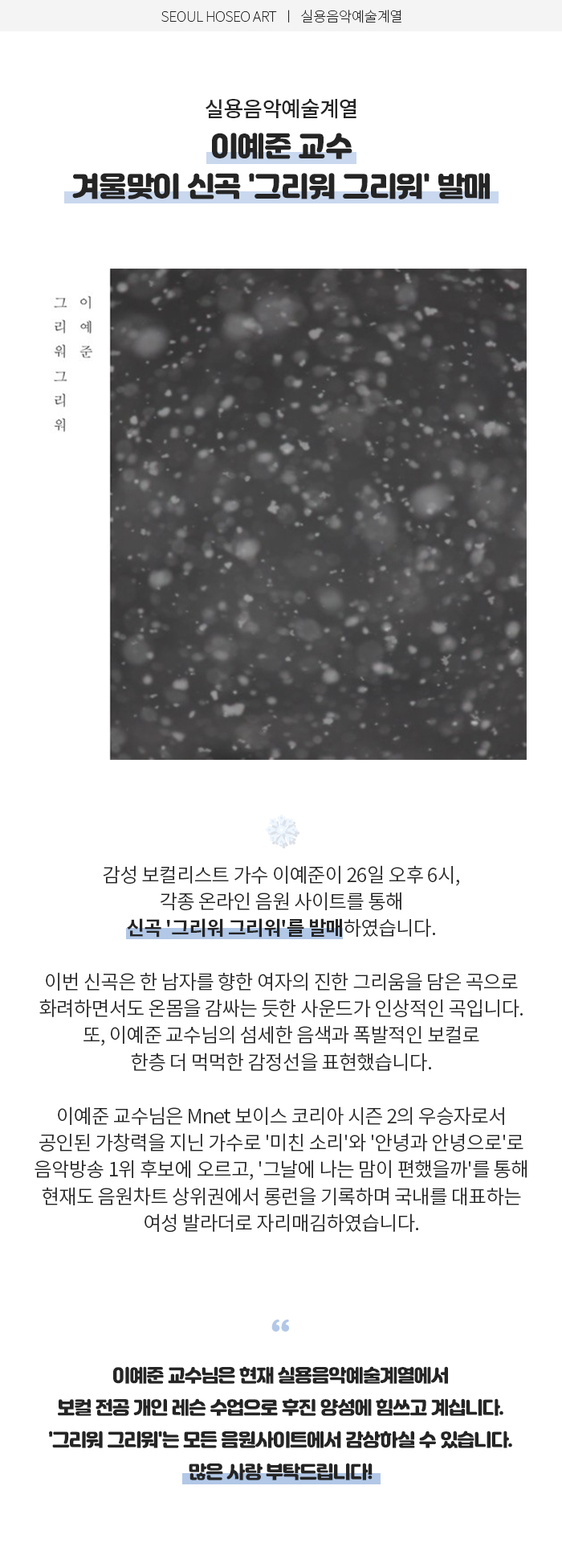 실용음악예술계열 이예준 교수, 겨울맞이 신곡 '그리워 그리워' 발매
