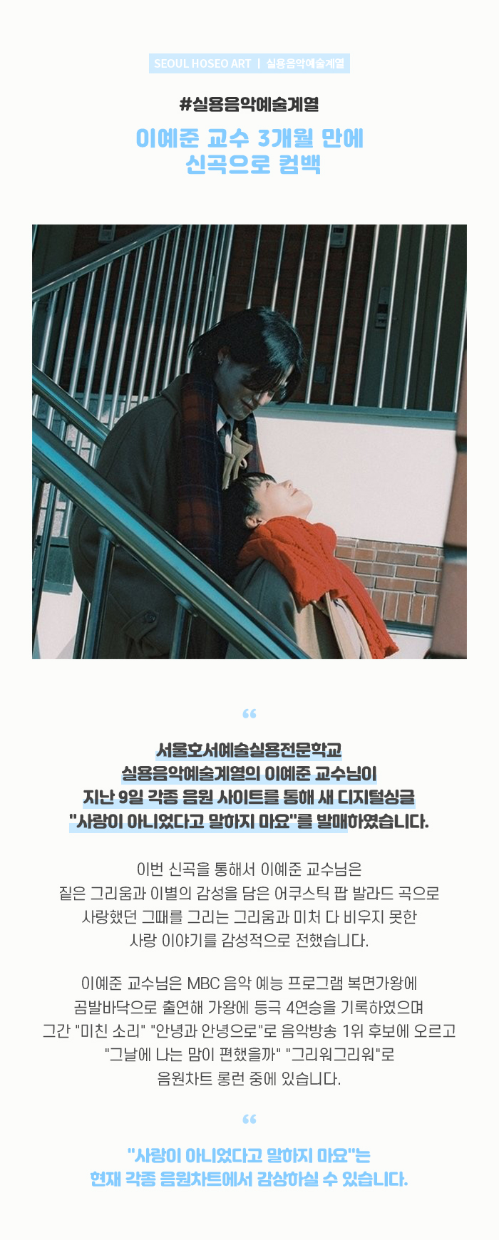 서울호서예술실용전문학교 실용음악예술계열의 이예준 교수님이 지난 9일 각종 음원 사이트를 통해 새 디지털싱글 "사랑이 아니었다고 말하지 마요"를 발매하였습니다. 이번 신곡을 통해서 이예준 교수님은 짙은 그리움과 이별의 감성을 담은 어쿠스틱 팝 발라드 곡으로 사랑했던 그때를 그리는 그리움과 미처 다 비우지 못한 사랑 이야기를 감성적으로 전했습니다.
