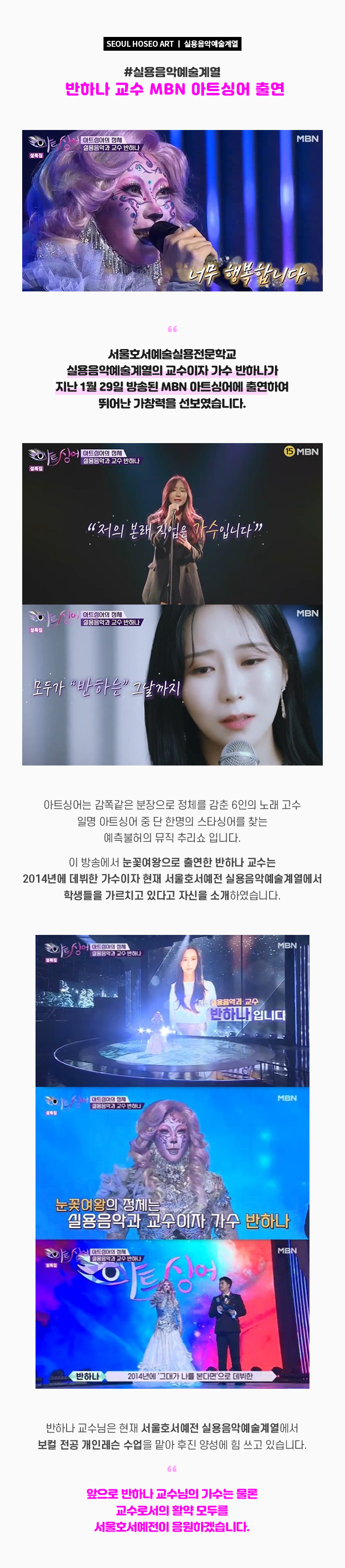 서울호서예술실용전문학교 실용음악예술계열의 교수이자 가수 반하나가 지난 1월 29일 방송된 MBN 아트싱어에 출연하여 뛰어난 가창력을 선보였습니다. 아트싱어는 감쪽같은 분장으로 정체를 감춘 6인의 노래 고수 일명 아트싱어 중 단 한명의 스타싱어를 찾는 예측불허의 뮤직 추리쇼 입니다. 이 방송에서 눈꽃여왕으로 출연한 반하나 교수는 2014년에 데뷔한 가수이자 현재 서울호서예전 실용음악예술계열에서 학생들을 가르치고 있다고 자신을 소개하였습니다.