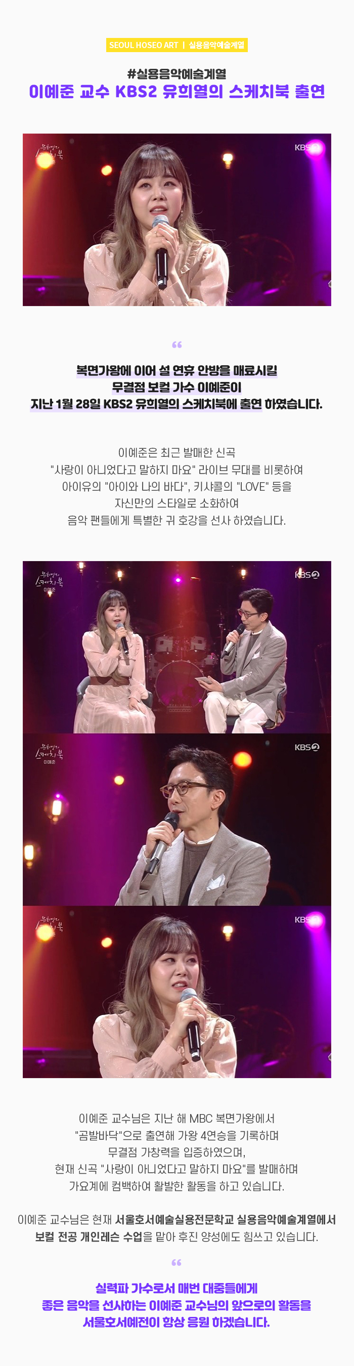 서울호서예술실용전문학교 실용음악예술계열 복면가왕에 이어 설 연휴 안방을 매료시킬 무결점 보컬 가수 이예준이 지난 1월 28일 KBS2 유희열의 스케치북에 출연 하였습니다. 이예준은 최근 발매한 신곡 "사랑이 아니었다고 말하지 마요" 라이브 무대를 비롯하여 아이유의 "아이와 나의 바다", 키샤콜의 "LOVE" 등을 자신만의 스타일로 소화하여 음악 팬들에게 특별한 귀 호강을 선사 하였습니다.