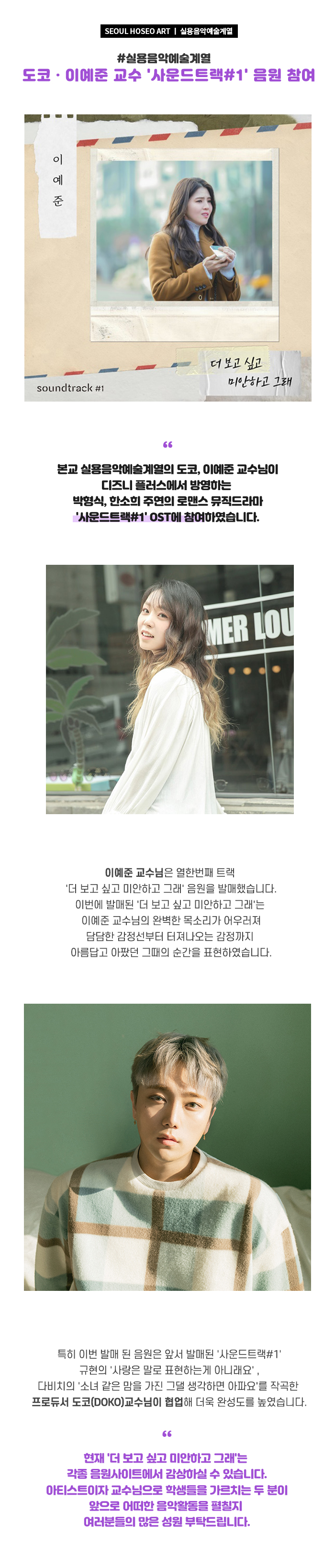 실용음악예술계열 교수 도코 · 이예준 '사운드트랙#1' 음원 참여