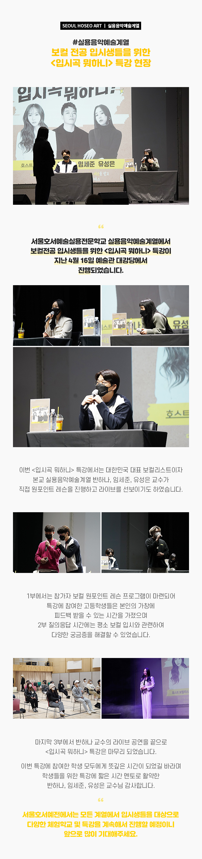 서울호서예술실용전문학교 실용음악예술계열에서 보컬전공 입시생들을 위한 <입시곡 뭐하니> 특강이 지난 4월 16일 예술관 대강당에서 진행되었습니다. 이번 <입시곡 뭐하니> 특강에서는 대한민국 대표 보컬리스트이자 본교 실용음악예술계열 반하나, 임세준, 유성은 교수가 직접 원포인트 레슨을 진행하고 라이브를 선보이기도 하였습니다.