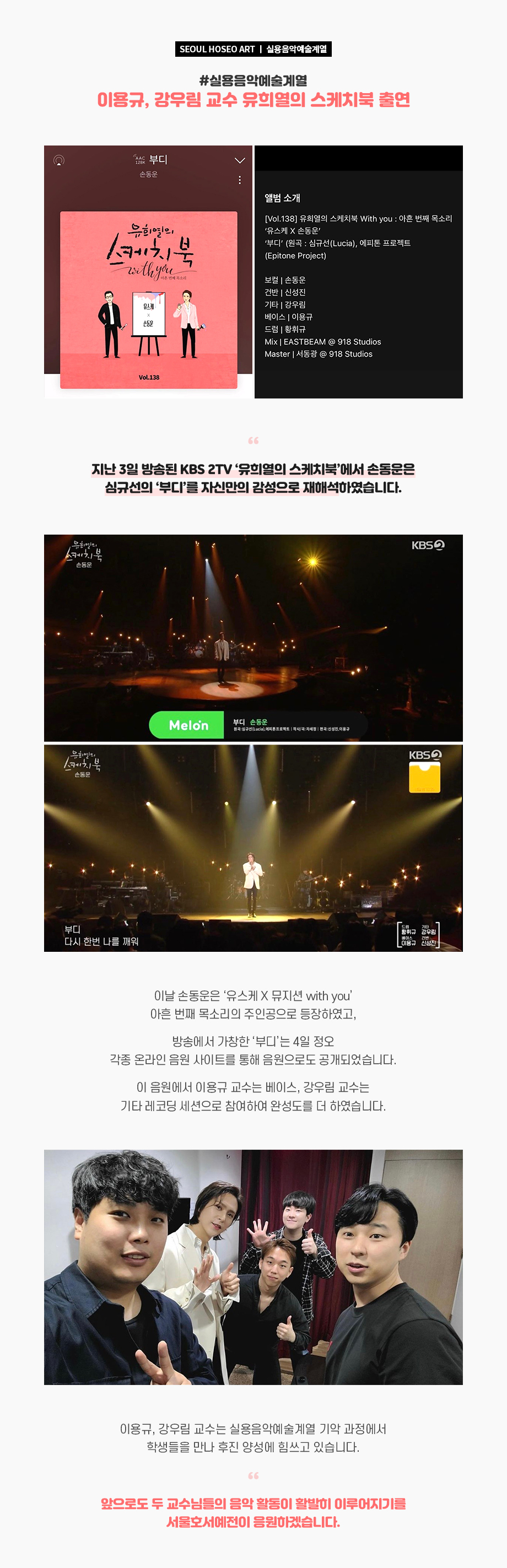 지난 3일 방송된 KBS 2TV ‘유희열의 스케치북’에서 손동운은 심규선의 ‘부디’를 자신만의 감성으로 재해석하였습니다. 이날 손동운은 ‘유스케 X 뮤지션 with you’ 아흔 번째 목소리의 주인공으로 등장하였고, 방송에서 가창한 ‘부디’는 4일 정오 각종 온라인 음원 사이트를 통해 음원으로도 공개되었습니다. 이 음원에서 이용규 교수는 베이스,강우림 교수는 기타 레코딩 세션으로 참여하여 완성도를 더 하였습니다.
