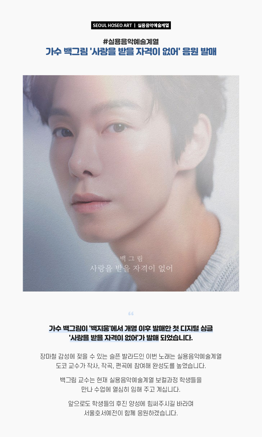 가수 백그림이 '백지웅'에서 개명 이후 발매한 첫 디지털 싱글 '사랑을 받을 자격이 없어'가 발매 되었습니다. 장마철 감성에 젖을 수 있는 슬픈 발라드인 이번 노래는 실용음악예술계열 도코 교수가 작사, 작곡, 편곡에 참여해 완성도를 높였습니다.