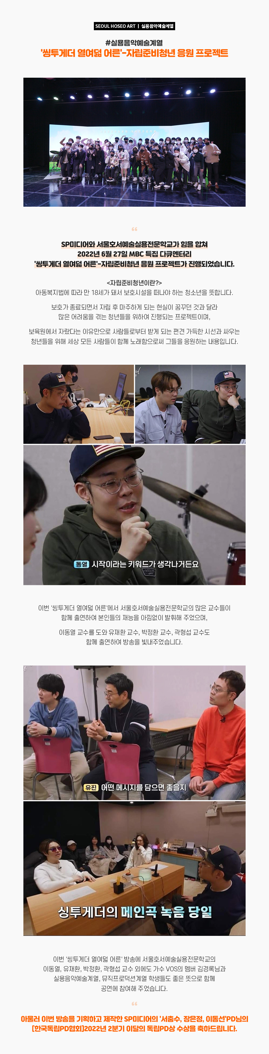 SP미디어와 서울호서예술실용전문학교가 힘을 합쳐 2022년 6월 27일 MBC 특집 다큐멘터리 '씽투게더 열여덟 어른'-자립준비청년 응원 프로젝트가 진행되었습니다. <자립준비청년이란?> 아동복지법에 따라 만 18세가 돼서 보호시설을 떠나야 하는 청소년을 뜻합니다.