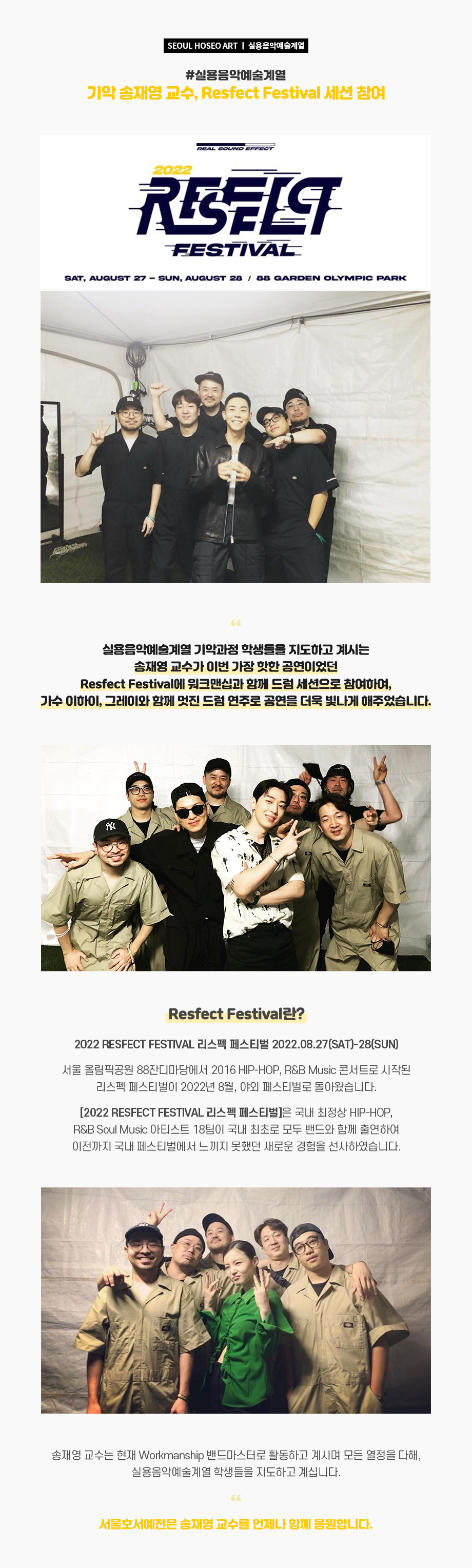 실용음악예술계열 기악과정 학생들을 지도하고 계시는 송재영 교수가 이번 가장 핫한 공연이었던 Resfect Festival에 워크맨십과 함께 드럼 세션으로 참여하여, 가수 이하이, 그레이와 함께 멋진 드럼 연주로 공연을 더욱 빛나게 해주었습니다.