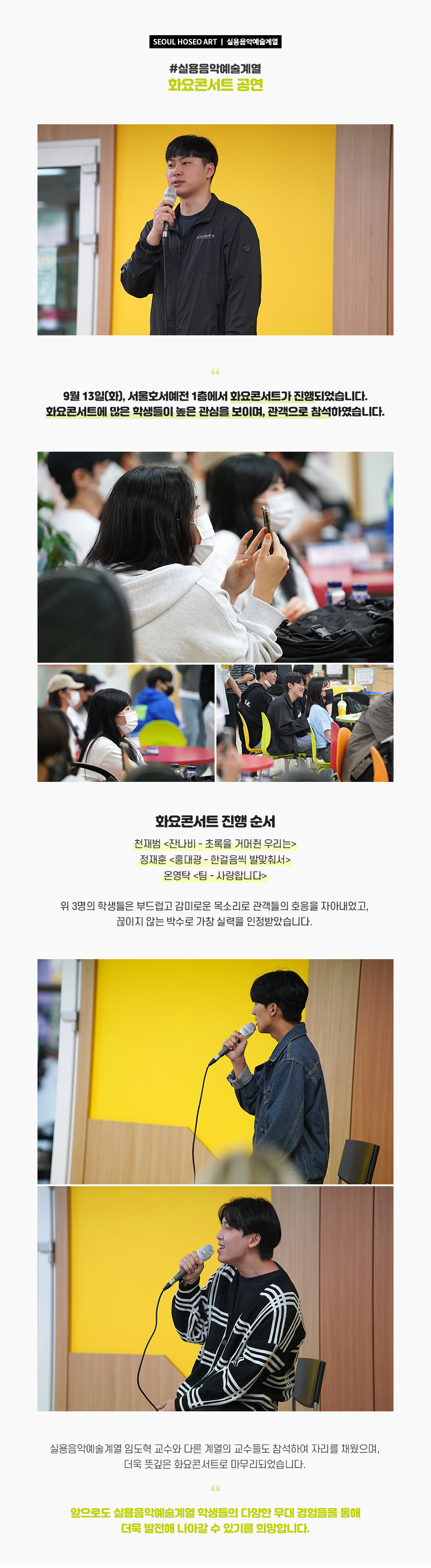 9월 13일(화), 서울호서예전 1층에서 화요콘서트가 진행되었습니다. 화요콘서트에 많은 학생들이 높은 관심을 보이며, 관객으로 참석하였습니다.