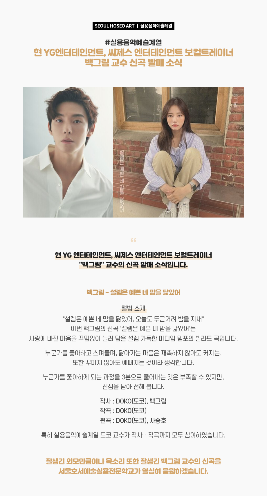 실용음악예술계열 현 YG엔터테인먼트, 씨제스 엔터테인먼트 보컬트레이너 백그림 교수 신곡 발매 소식