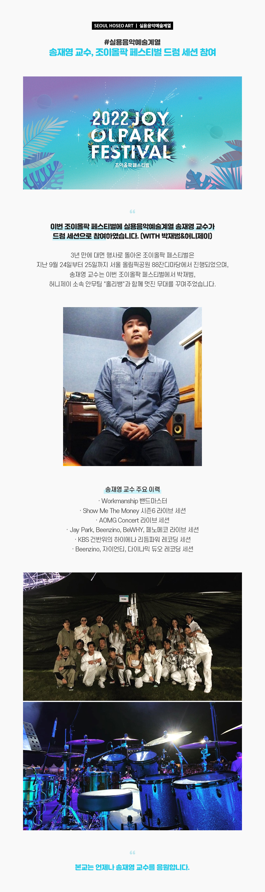 이번 조이올팍 페스티벌에 실용음악예술계열 송재영 교수가 드럼 세션으로 참여하였습니다. (WITH 박재범&허니제이) 3년 만에 대면 행사로 돌아온 조이올팍 페스티벌은 지난 9월 24일부터 25일까지 서울 올림픽공원 88잔디마당에서 진행되었으며, 송재영 교수는 이번 조이올팍 페스티벌에서 박재범, 허니제이 소속 안무팀 "홀리뱅"과 함께 멋진 무대를 꾸며주었습니다.