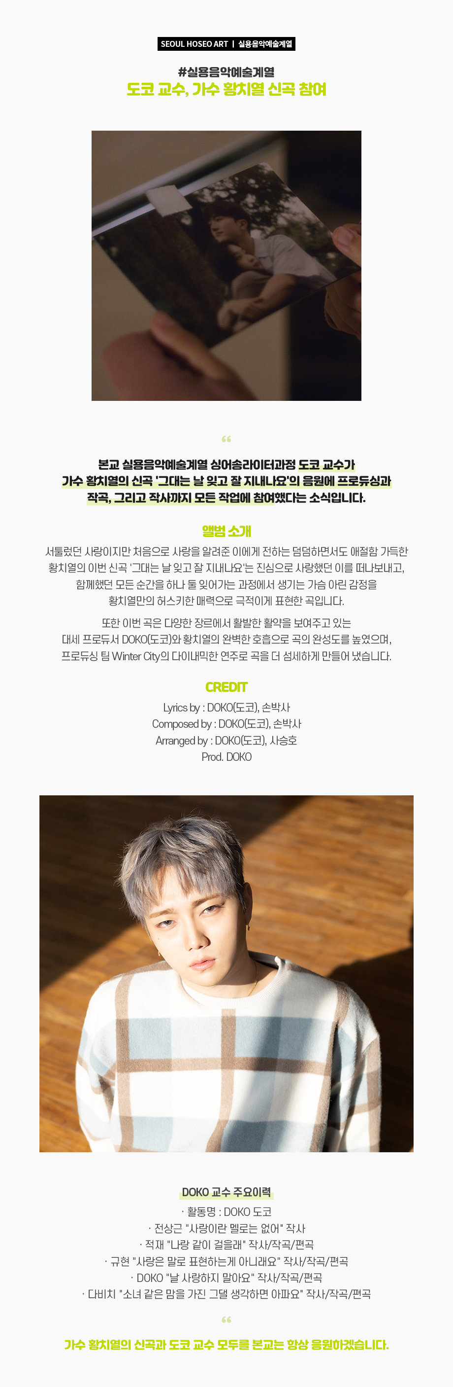 본교 실용음악예술계열 싱어송라이터과정 도코 교수가 가수 황치열의 신곡 '그대는 날 잊고 잘 지내나요'의 음원에 프로듀싱과 작곡, 그리고 작사까지 모든 작업에 참여했다는 소식입니다.